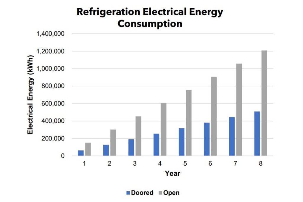 Recognizing the need for a more effective solution, WAVE carried out a detailed analysis showing the reduction in cold air spillage form retrofitted doors and “True-Doored” cases. The results of this study clearly showed that open display cases with doors retrofitted although the evaporating temperature can be increased, and duty will reduce but  savings will not be optimal. However, ‘True-Doored’ cases – designed to operate with doors and have much improved airflow for use with doors. In addition, the study quantified the effect of doors in reducing the heat requirement for the store as they prevented cold air from escaping and warm air from entering.