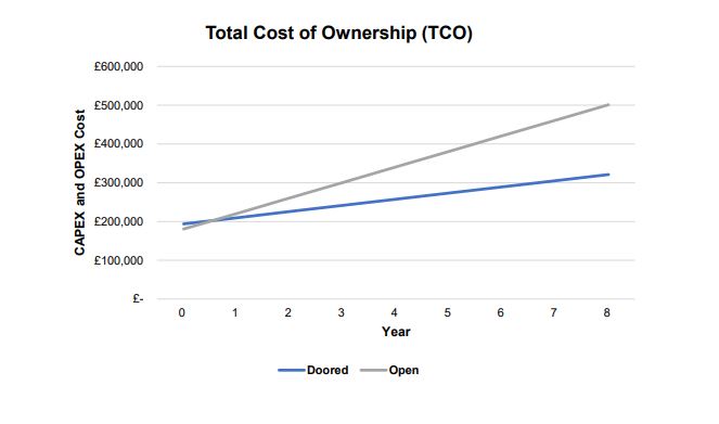 • Although the capital costs are higher for doored cases some of the expenditure is offset by reduction in refrigeration plant size.