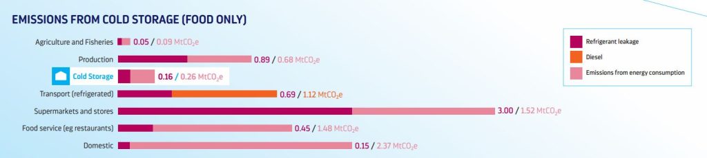 Among the intriguing findings of the survey, one important insight emerges regarding the total carbon dioxide (CO2) emissions associated with cold storage. The report reveals that these emissions amount to 0.42 MtCO2e (million metric tonnes of CO2 equivalent). When examining the sources of these emissions, it becomes apparent that refrigerant leakage accounts for 38.1% of the total, while direct emissions resulting from energy consumption make up the remaining 61.9%, equivalent to 0.26 MtCO2e. This data underscores that to achieve sustainability goals, it is crucial to focus on two critical aspects: minimizing refrigerant leakage and improving energy efficiency.